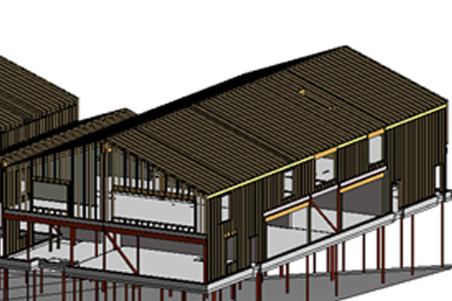 Grundkonstruktionen utförs som platsgjuten bottenplatta grundlagd på spetsbärande stålpålar. Stommen för huset består av en trästomme med mellanbjälklag av håldäck som vilar på stålbalkar och -pelare samt enstaka betongväggar. Trästommen består av bärande väggar, nockbalk och takbalkar samt av bärande limträbalkar. Över matsalen bärs taket av synliga takstolar som vilar på limträpelare.