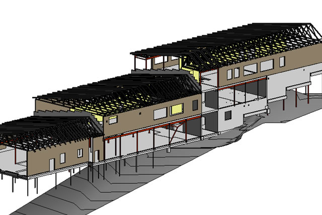 Eftersom berget under byggnaden sluttar starkt under byggnaden samt att denna är utformat som ett suterränghus skiljer sig grundläggningen mellan de olika planen. Grundkonstruktionen på plan 1 utförs delvis som platsgjuten bottenplatta grundlagd på spetsbärande stålpålar och delvis som platta på mark med lastfördelande kant- och grundbalkar. Grundkonstruktionerna för plan 2 & 3 utförs som pålade grundmurar runt en krypgrund. Bjälklaget över krypgrunden utformas med håldäck. Stommen för huset består av en trästomme med mellanbjälklag av håldäck som vilar på stålbalkar och pelare samt enstaka betongväggar. Trästommen består av bärande väggar och fackverkstakstolar.